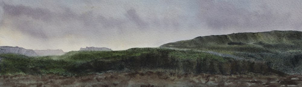 // In the current exhibition in Akureyri there are some works in which I venture to portray dusk. The challenge is usually to catch the range of luminosity experienced. This range often takes the form of a chromatic scale (if you like) from a zero point somewhere in the picture over to nuances of the darkest dark. The composition is governed by the zero point but I often find that it is quite interesting to split the point in two when choosing the motive in order for the zero point to fall on both sides of some prominence in the distance. Dalbæjarstapinn aquarelle 20,5×37,5 2014