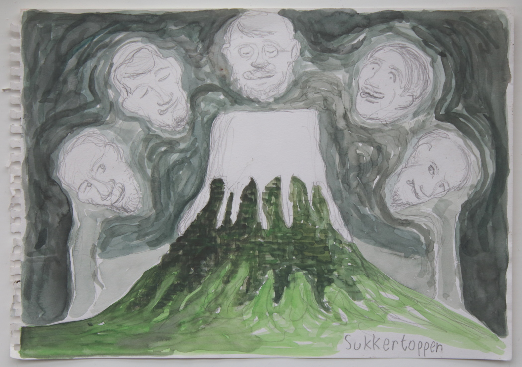 This issue of such less than dignified handling of Mt. Kirkjufell may have been in my mind when I during my art studies rendered the colored drawing above. This was probably in Autumn 1987, when I was wondering about all kinds of ‘cultural landscapes’ (or so to speak) where heads of men (always men) were hanging suspended over mountains and valleys. Such speculations were very much in vogue at the time.